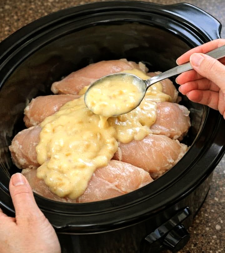 1. Place chicken breasts in a single layer at the bottom of a 4–6 quart slow cooker.