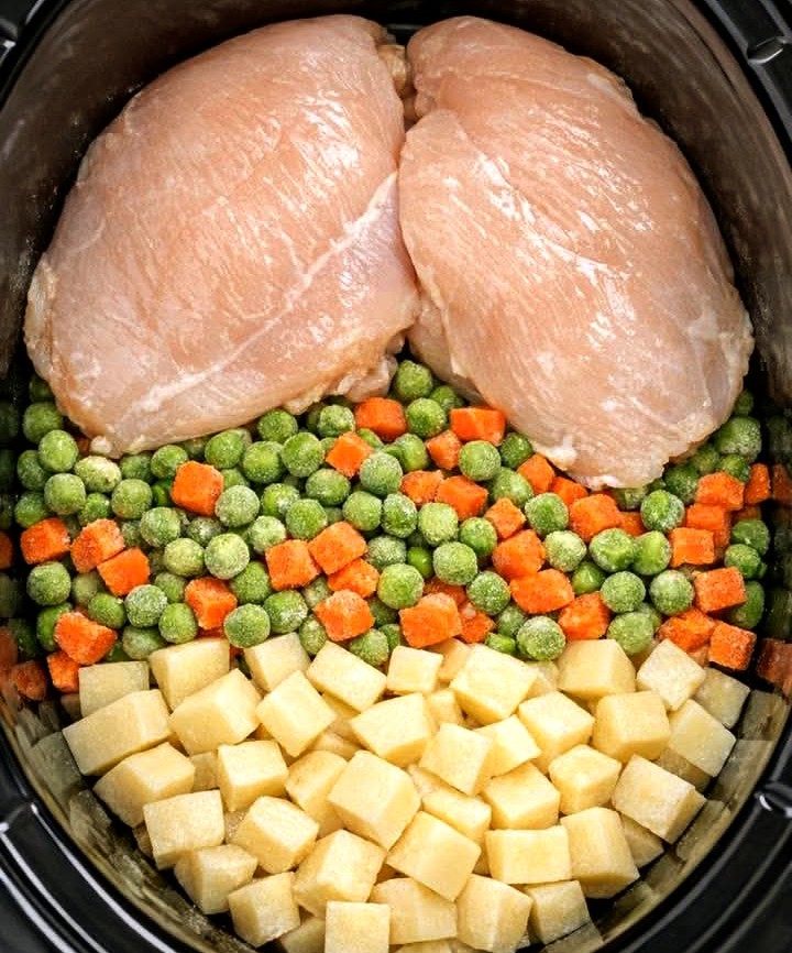 Add potatoes, peas, carrots, onion, and garlic to your slow cooker. This creates the classic chicken pot pie filling flavor.