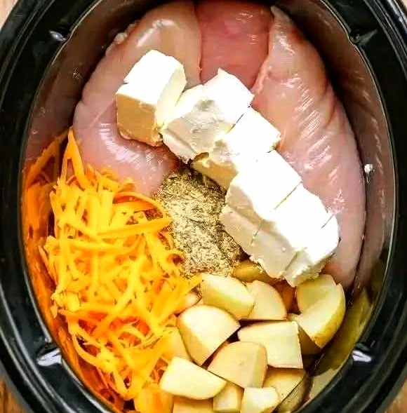 Add the cream cheese, shredded cheddar, potatoes, and ranch seasoning on top of the chicken.