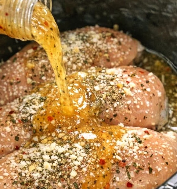 Pour the Italian dressing evenly over the chicken, turning slightly to coat.