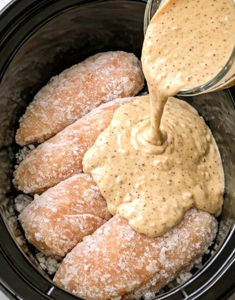 Place the frozen chicken breasts in a single layer at the bottom of your slow cooker.