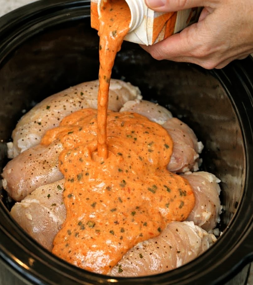 Cook: Cover and cook on LOW for 4–5 hours or on HIGH for 2 1/2–3 hours, until the chicken is tender and registers 165°F at the thickest part.