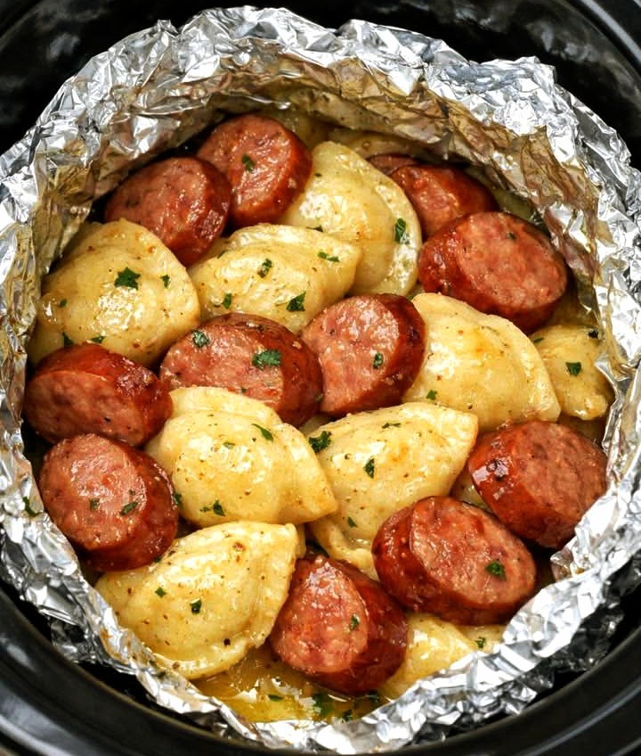 Slow Cooker Foil Packet Sausage and Pierogies