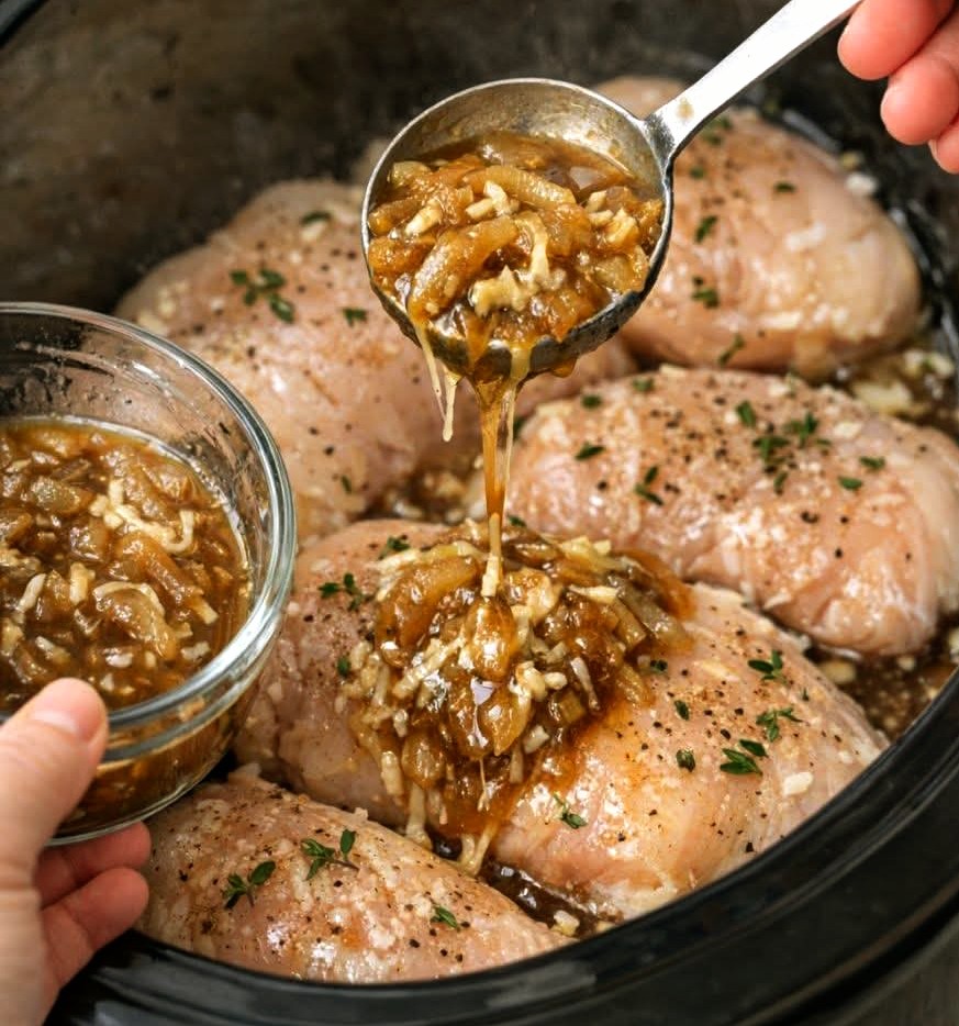 Instead of standing over the stove or juggling multiple dishes, you whisk together one savory onion and cheese mixture and pour it directly over raw chicken breasts in the slow cooker. As it gently cooks, the onions melt into the sauce, the cheese enriches every bite, and the chicken becomes unbelievably tender and juicy.