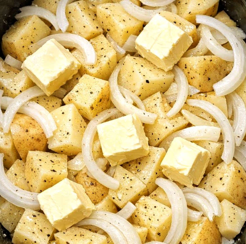 Add the sliced onions and garlic to the bottom of a 5- to 6-quart slow cooker. Place the potatoes on top and scatter the butter pieces evenly over them.