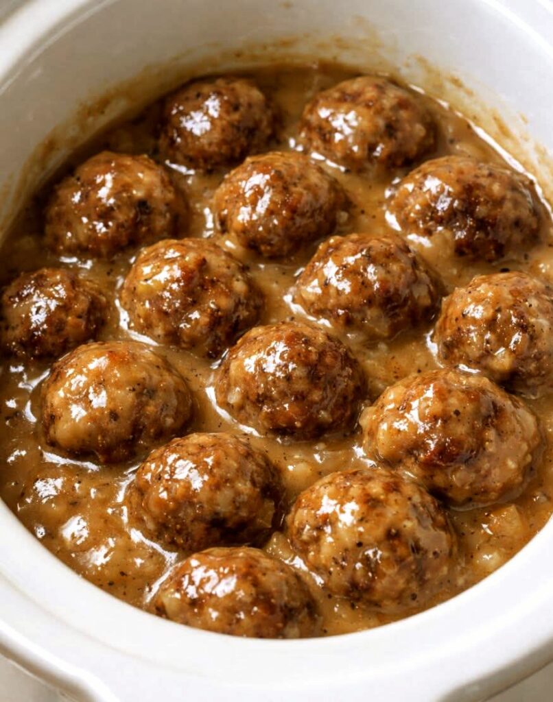 Slow cooking allows the flavors to blend together, creating tender meatballs in thick savory gravy that tastes like it simmered all day.