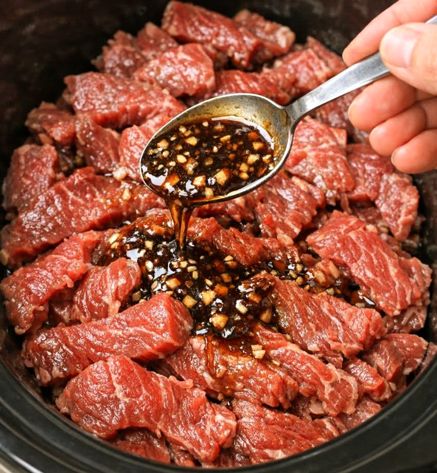 Spoon the sauce mixture over the beef. Gently stir inside the slow cooker to evenly coat all the meat.