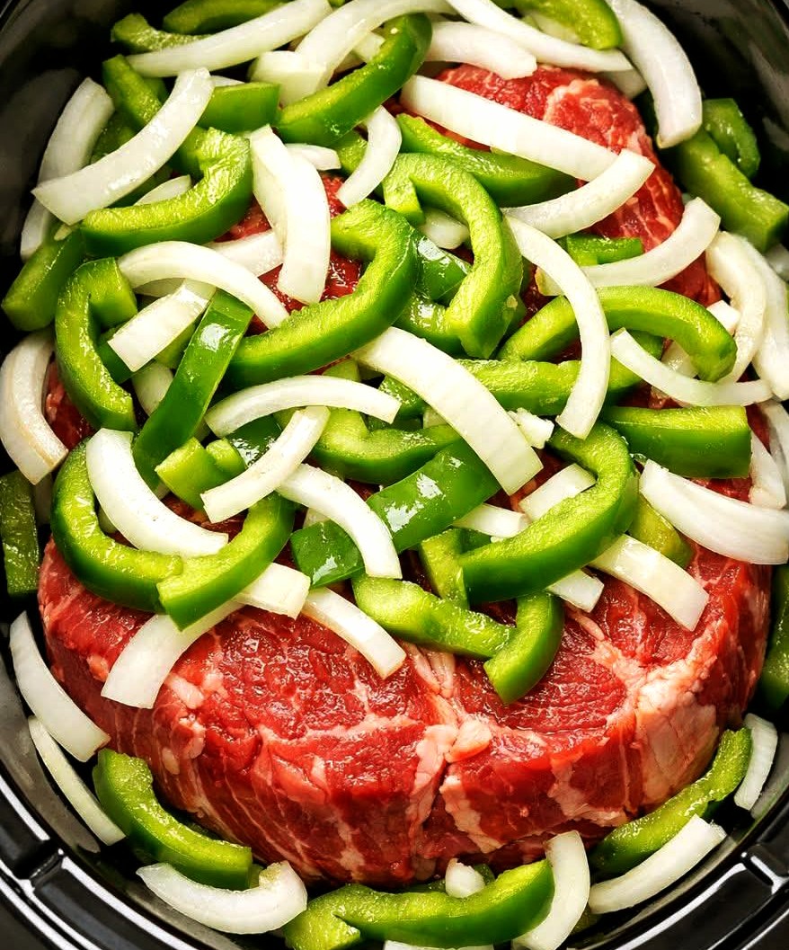 Layer the sliced onions and bell peppers on top and around the beef, tucking some along the sides so they cook in the juices.