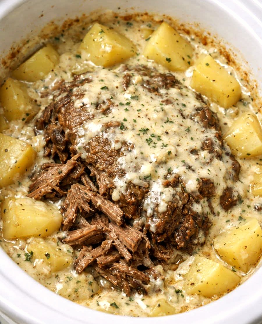 This creamy ranch pot roast with potatoes is a family favorite because it requires minimal preparation while delivering rich flavor and hearty satisfaction. The slow cooker gently blends ranch seasoning, beef juices, and cream into a savory herb gravy that coats the roast and potatoes beautifully.