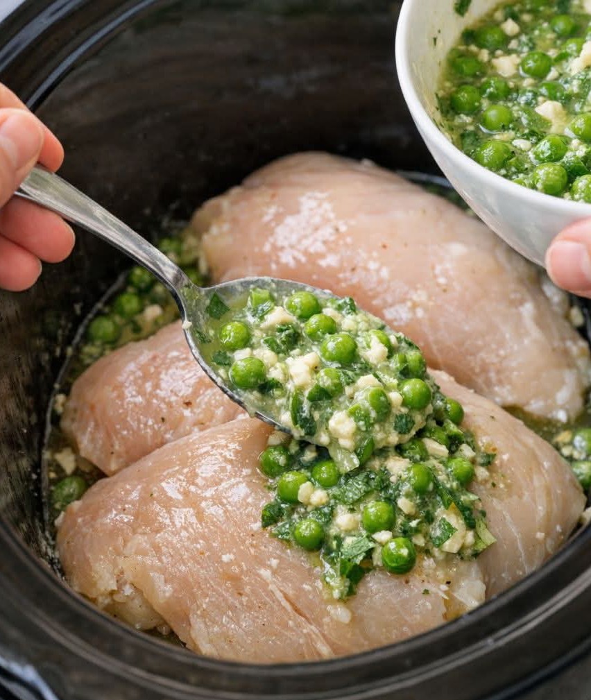 Spoon the pea-mint mixture evenly over the chicken breasts, coating each piece thoroughly. Cover and cook on LOW for 3½–4½ hours or HIGH for 2–3 hours, until chicken reaches 165°F and is easily shredded.