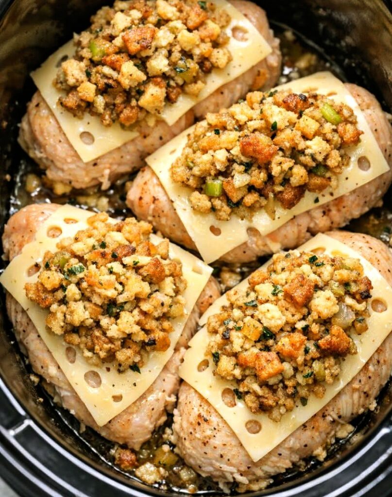 Cover and cook on LOW for 5–6 hours or HIGH for 3–4 hours, until the chicken is tender and the stuffing is soft with lightly crisp edges.