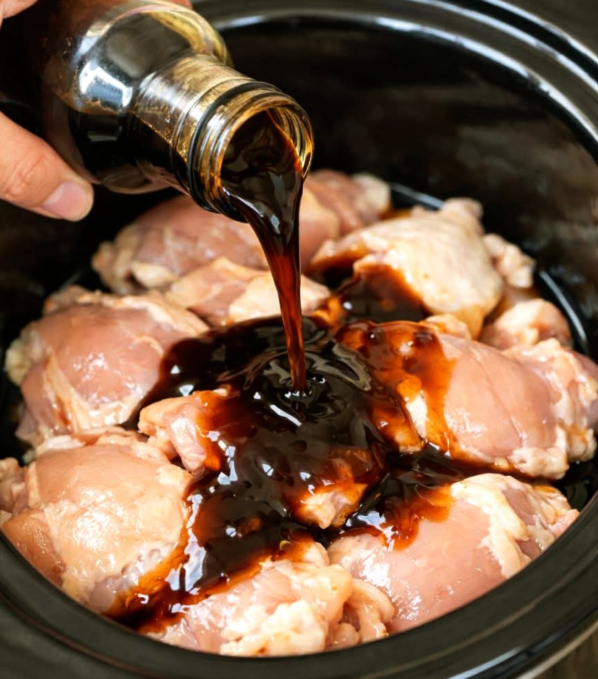 Arrange the boneless chicken thighs in an even layer at the bottom of a 4- to 6-quart slow cooker. Slight overlap is fine, but avoid stacking tightly so the sauce coats evenly.
