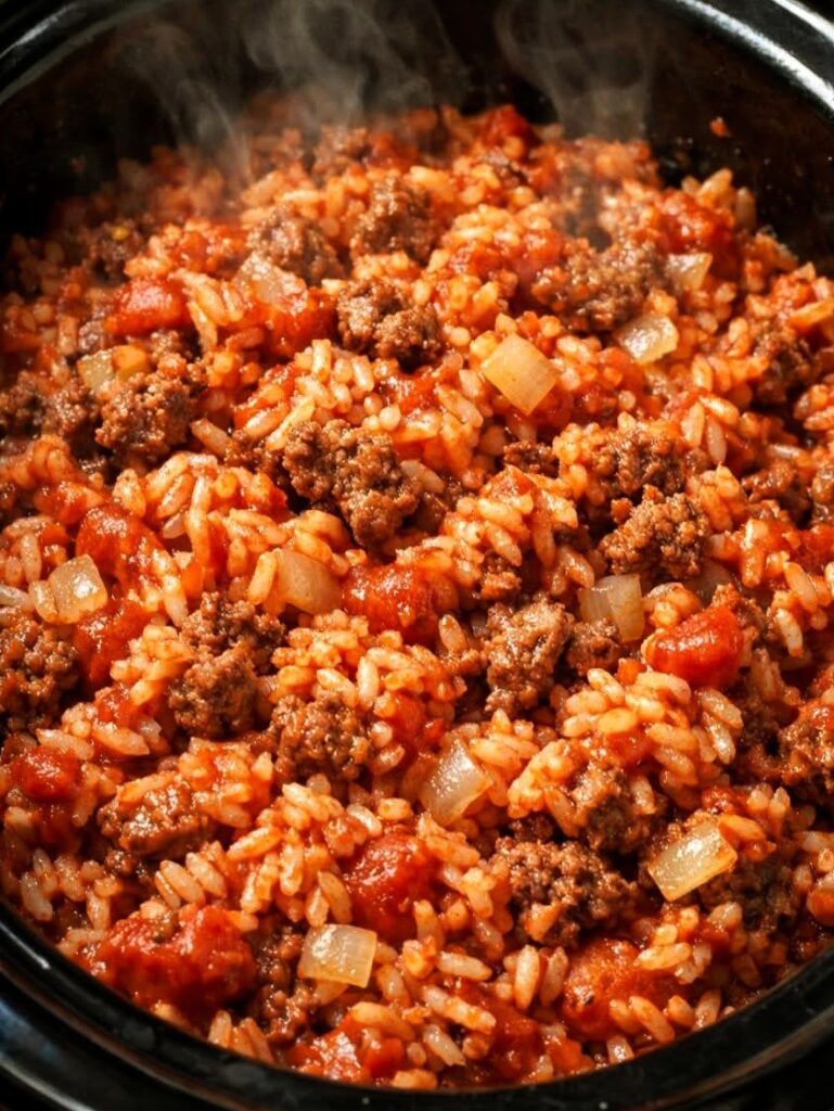 This old-fashioned Texas hash recipe is ideal for busy weeknights, meal prep, or feeding a large family on a budget. The slow cooker allows the rice to absorb the rich tomato flavor while the beef and onions create a delicious, savory base.