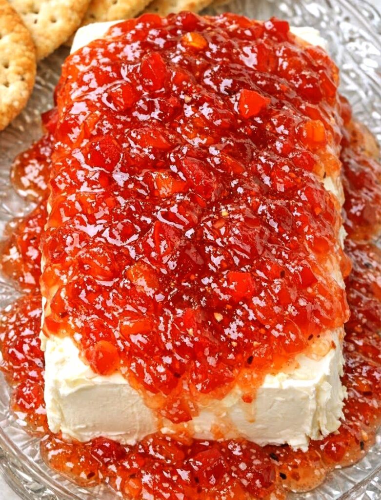 Assemble the dip: Spoon the pepper jelly over the cream cheese, allowing it to cascade slightly down the sides. Let some pool around the base for a glossy, inviting presentation.
