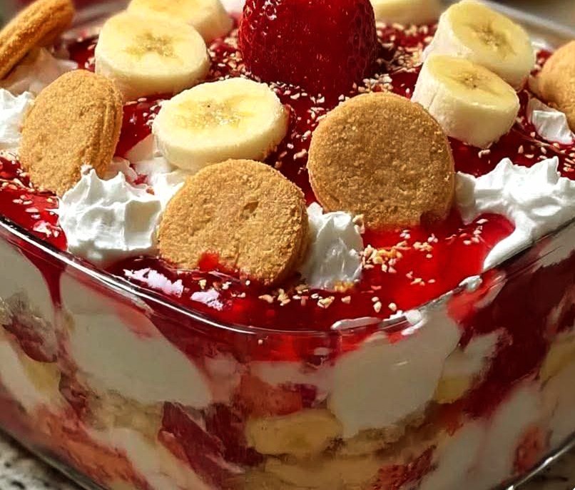 This Strawberry Banana Pudding Dream is a rich, creamy, and refreshing no-bake dessert made with layers of vanilla pudding, cream cheese, whipped cream, fresh strawberries, bananas, and crunchy vanilla wafers.